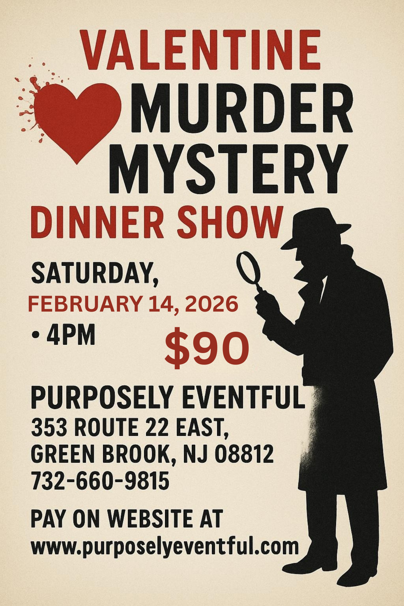 Step into a night of romance, mystery, and suspense this Valentine’s Day! 🔎❤️ Join us for an unforgettable Valentine Murder Mystery Dinner Show — where every clue counts and every bite brings you closer to solving the case.